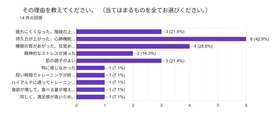 「体の変化を感じた理由を教えてください」という問いに対して、「持久力が上がった、心肺機能が向上した」と回答した人が78%という結果(注2)になりました。